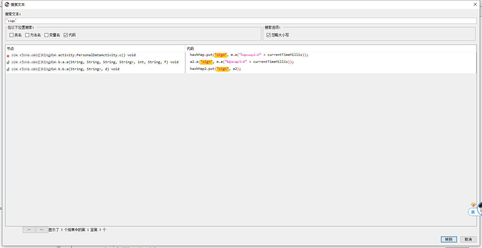 有了源码就直接检索算法了,进jadx,Ctrl+Shift+F 检索签名字段的名称,我这里是sign。所以我直接检索 "sign",加双引号是为了提高精确度。